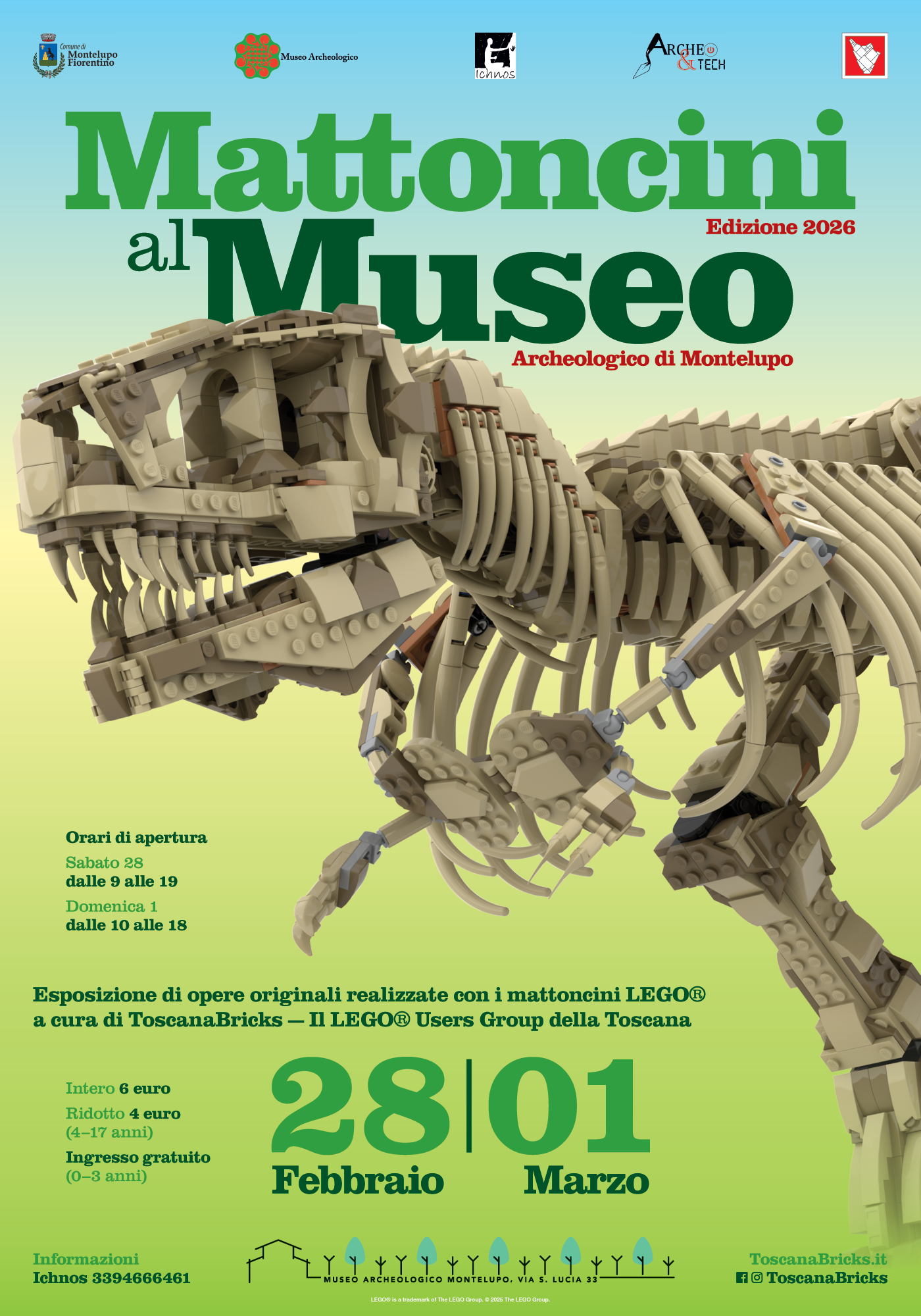 Il Museo Archeologico di Montelupo apre le sue porte per il quarto anno consecutivo ai mattoncini più famosi del mondo e ospiterà per un intero weekend le opere originali degli amici di ToscanaBricks — Il LEGO® Users Group della Toscana, che faranno da contorno e arricchiranno le aree tematiche del museo. Non mancheranno laboratori creativi di costruzione e un’area di gioco libero.
